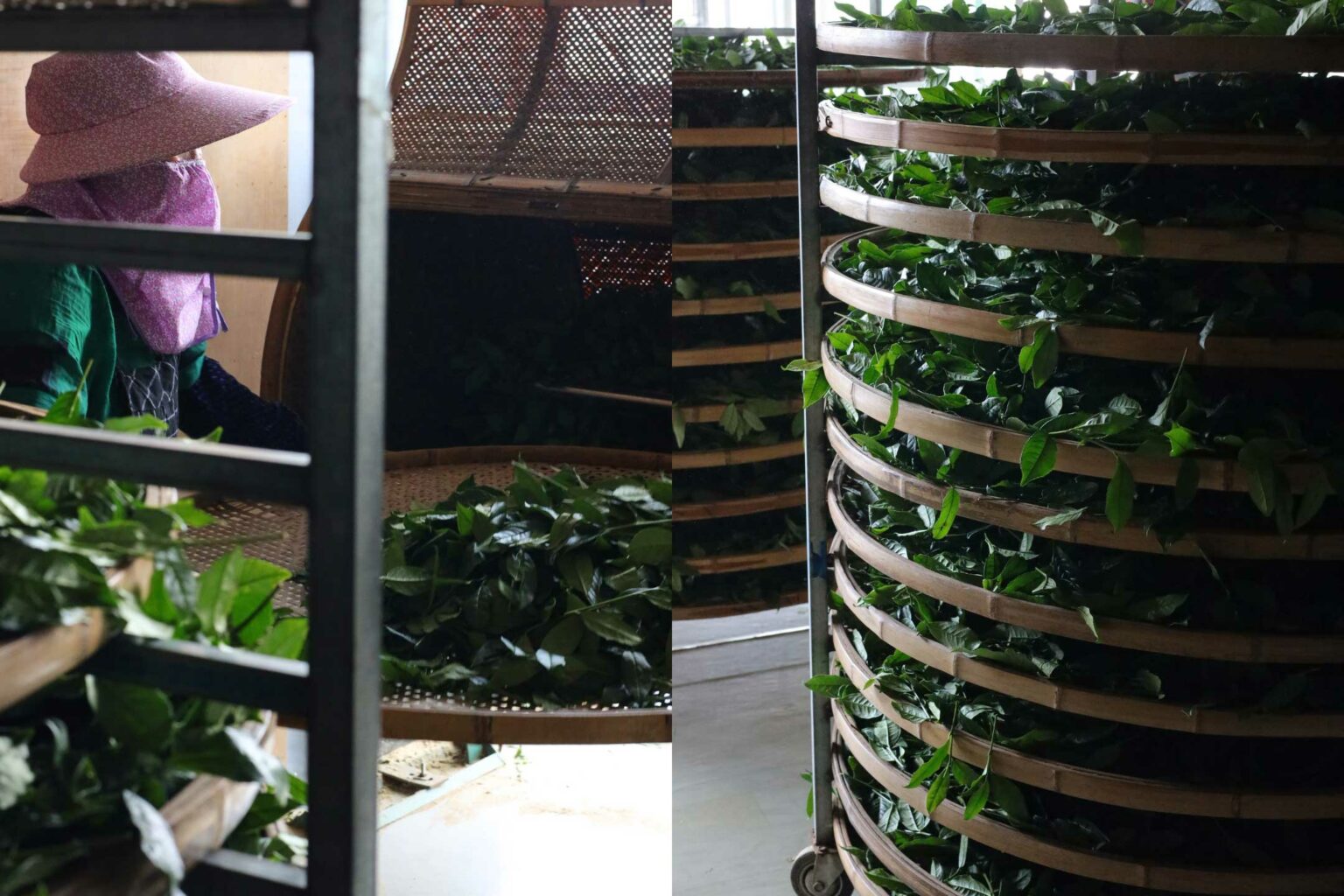 This process typically begins outdoors, where the tea leaves are spread out on bamboo sieves and exposed to sunlight or diffused light under movable shades. During this time, the leaves lose moisture and become flaccid, making them more pliable for further processing. To ensure even withering, the leaves are periodically mixed. For some Oolongs this process takes around 2 hours while some types might require upto 8 hours of withering. After several hours of sun exposure, the leaves are moved indoors to specialised storage areas, where they “come back to life” in a controlled environment, regaining some moisture and resilience. This alternating exposure to sun and indoor conditions is repeated to achieve the desired flexibility and around a 6-20% reduction in leaf moisture. This careful management of humidity and texture also helps in the development of the tea’s fragrance.
